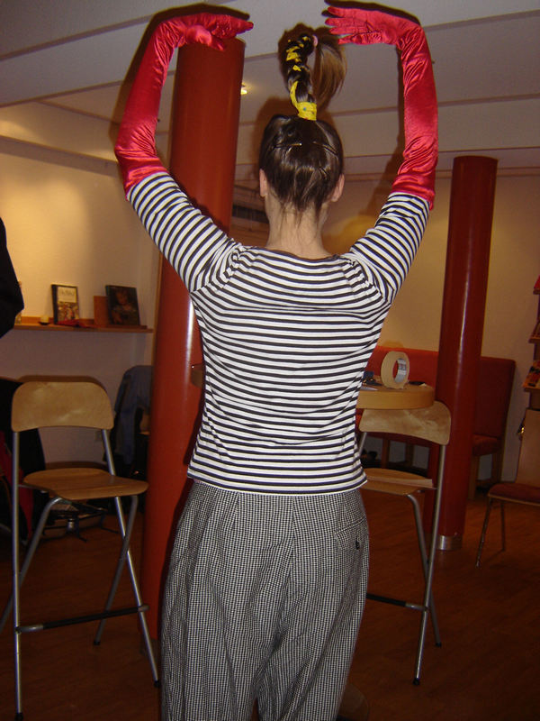 Vor dem Auftritt in St. Johann: Clownin Matinta, Clown Confetto, Närrin Rabazza, Clown Paula, Clown Anjol, Clown Kara